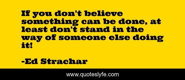 This page presents the quote "If you don't believe something can be done, at least don't stand in the way of someone else doing it!". Author of this quote is Ed Strachar. This quote is about spirituality, healing,.