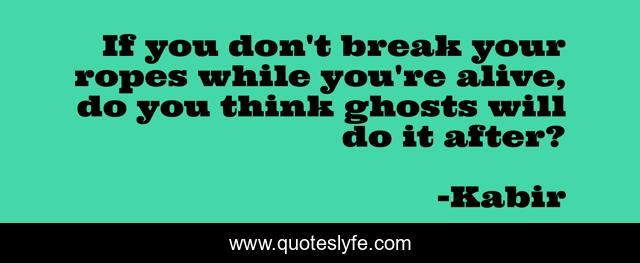 This page presents the quote "If you don't break your ropes while you're alive, do you think ghosts will do it after?". Author of this quote is Kabir. This quote is about liberation, metaphysics, spirituality,.