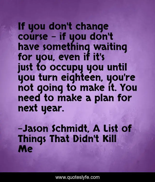This page presents the quote "If you don't change course - if you don't have something waiting for you, even if it's just to occupy you until you turn eighteen, you're not going to make it. You need to make a plan for next year.". Author of this quote is Jason Schmidt, A List of Things That Didn't Kill Me. This quote is about future-plans, young-adult, guidance,.