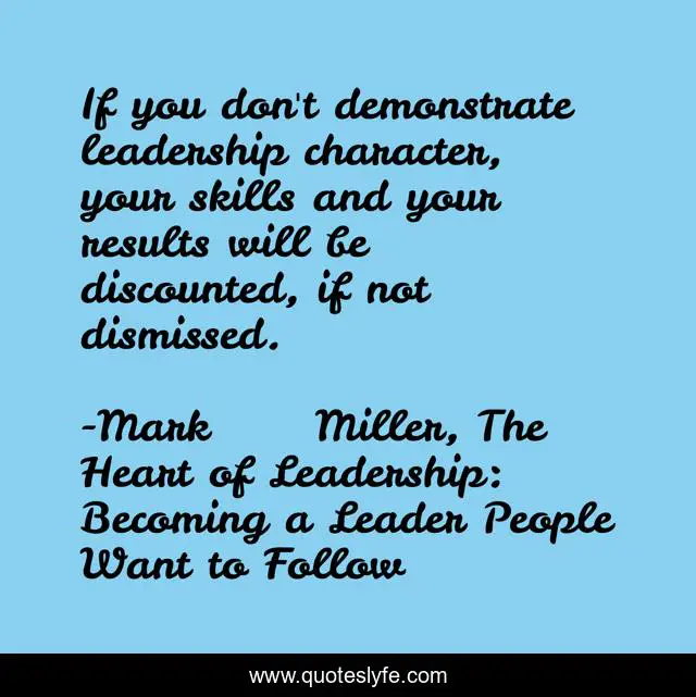 This page presents the quote "If you don't demonstrate leadership character, your skills and your results will be discounted, if not dismissed.". Author of this quote is Mark Miller, The Heart of Leadership: Becoming a Leader People Want to Follow. This quote is about leadership, character,.
