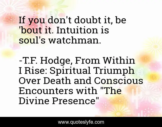 This page presents the quote "If you don't doubt it, be 'bout it. Intuition is soul's watchman.". Author of this quote is T.F. Hodge, From Within I Rise: Spiritual Triumph Over Death and Conscious Encounters with "The Divine Presence". This quote is about real, intuition, hesitation, apprehension, doubt, good-feeling,.
