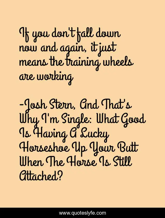 This page presents the quote "If you don't fall down now and again, it just means the training wheels are working". Author of this quote is Josh Stern, And That's Why I'm Single: What Good Is Having A Lucky Horseshoe Up Your Butt When The Horse Is Still Attached?. This quote is about training, humor, down, surreal, absurd, fall, funny-and-random, wheels, comedy,.