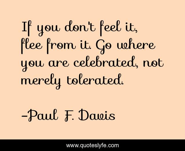 This page presents the quote "If you don't feel it, flee from it. Go where you are celebrated, not merely tolerated.". Author of this quote is Paul F. Davis. This quote is about feel, go, feelings, celebrate, wisdom,.