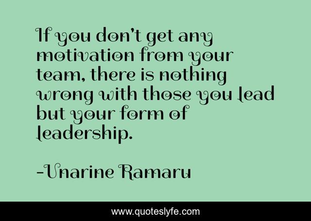 This page presents the quote "If you don't get any motivation from your team, there is nothing wrong with those you lead but your form of leadership.". Author of this quote is Unarine Ramaru. This quote is about leader, motivation, business, entrepreneurship, follower, leadership, team, working-hard,.