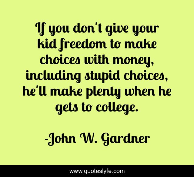 This page presents the quote "If you don't give your kid freedom to make choices with money, including stupid choices, he'll make plenty when he gets to college.". Author of this quote is John W. Gardner. This quote is about freedom, stupid, college,.