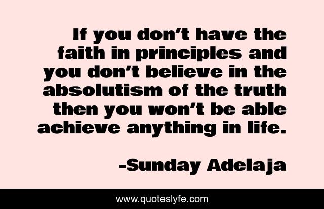 This page presents the quote "If you don’t have the faith in principles and you don’t believe in the absolutism of the truth then you won’t be able achieve anything in life.". Author of this quote is Sunday Adelaja. This quote is about achievements, faith, life, belief, principles, truth,.