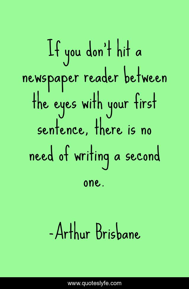 This page presents the quote "If you don't hit a newspaper reader between the eyes with your first sentence, there is no need of writing a second one.". Author of this quote is Arthur Brisbane. This quote is about newspaper, hearst, journalism,.
