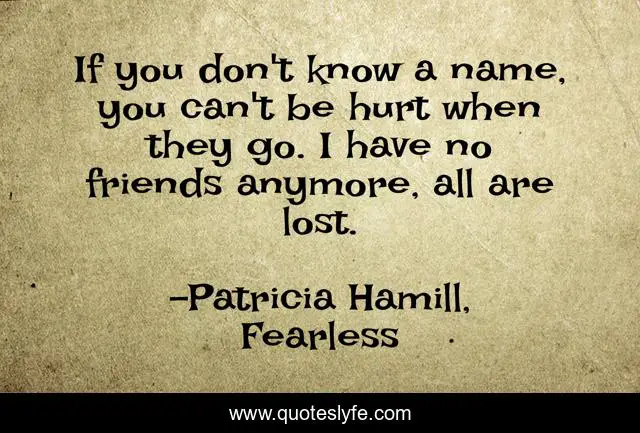 This page presents the quote "If you don't know a name, you can't be hurt when they go. I have no friends anymore, all are lost.". Author of this quote is Patricia Hamill, Fearless. This quote is about loss, names, dystopian, zombie-apocalypse,.