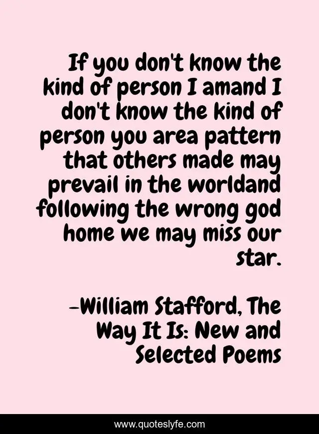 This page presents the quote "If you don't know the kind of person I amand I don't know the kind of person you area pattern that others made may prevail in the worldand following the wrong god home we may miss our star.". Author of this quote is William Stafford, The Way It Is: New and Selected Poems. .
