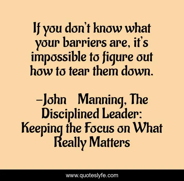 This page presents the quote "If you don’t know what your barriers are, it’s impossible to figure out how to tear them down.". Author of this quote is John Manning, The Disciplined Leader: Keeping the Focus on What Really Matters. This quote is about barriers, leadership, leaders, leadership-development,.