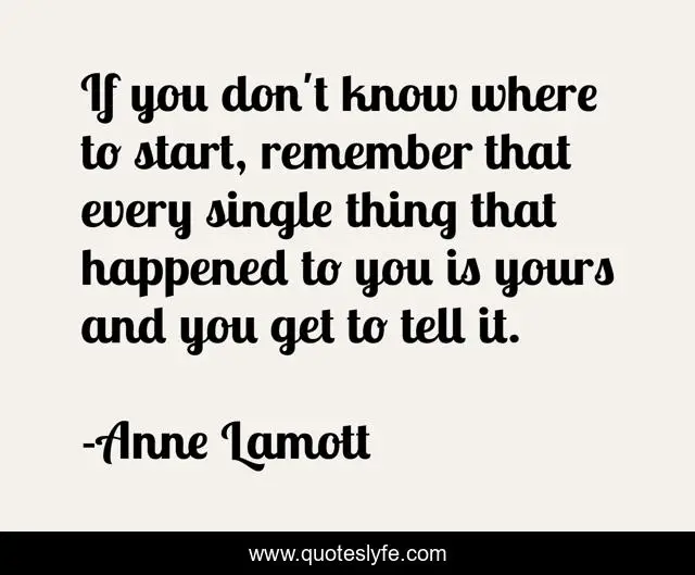 This page presents the quote "If you don't know where to start, remember that every single thing that happened to you is yours and you get to tell it.". Author of this quote is Anne Lamott. This quote is about stories, writing,.