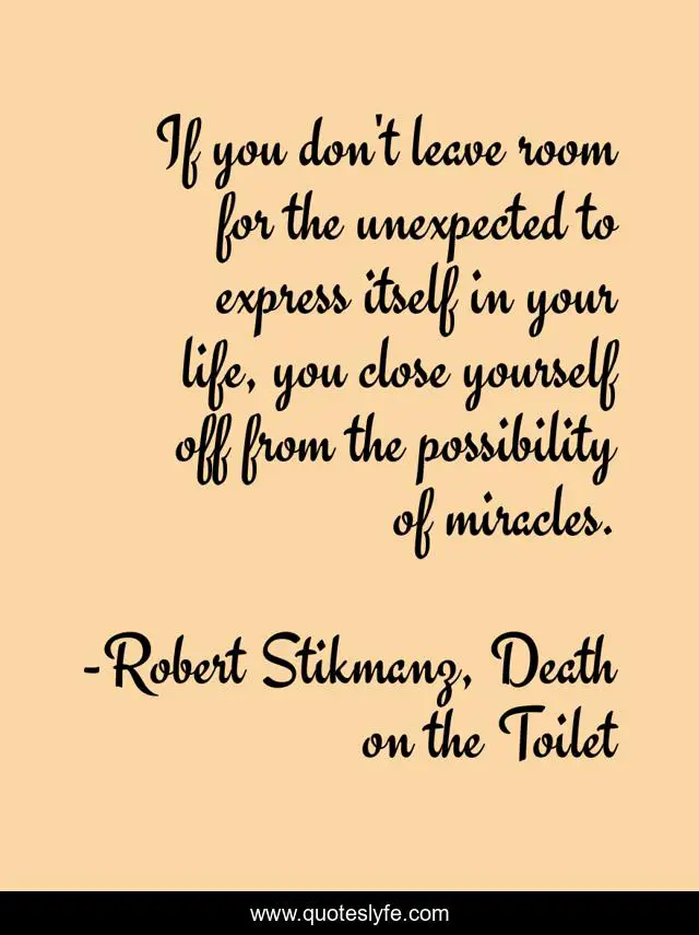 This page presents the quote "If you don't leave room for the unexpected to express itself in your life, you close yourself off from the possibility of miracles.". Author of this quote is Robert Stikmanz, Death on the Toilet. This quote is about fantasy, humor, science-fiction,.