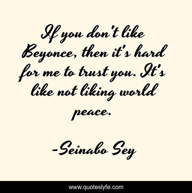 This page presents the quote "If you don't like Beyonce, then it's hard for me to trust you. It's like not liking world peace.". Author of this quote is Seinabo Sey. This quote is about me, world, peace,.