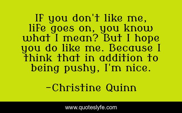 This page presents the quote "If you don't like me, life goes on, you know what I mean? But I hope you do like me. Because I think that in addition to being pushy, I'm nice.". Author of this quote is Christine Quinn. This quote is about me, life, nice,.