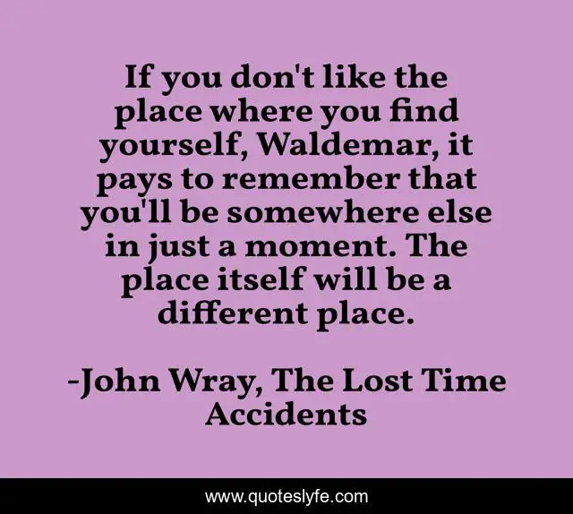 This page presents the quote "If you don't like the place where you find yourself, Waldemar, it pays to remember that you'll be somewhere else in just a moment. The place itself will be a different place.". Author of this quote is John Wray, The Lost Time Accidents. .