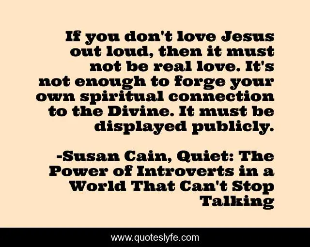 This page presents the quote "If you don't love Jesus out loud, then it must not be real love. It's not enough to forge your own spiritual connection to the Divine. It must be displayed publicly.". Author of this quote is Susan Cain, Quiet: The Power of Introverts in a World That Can't Stop Talking. This quote is about evangelism, extroversion, personality,.