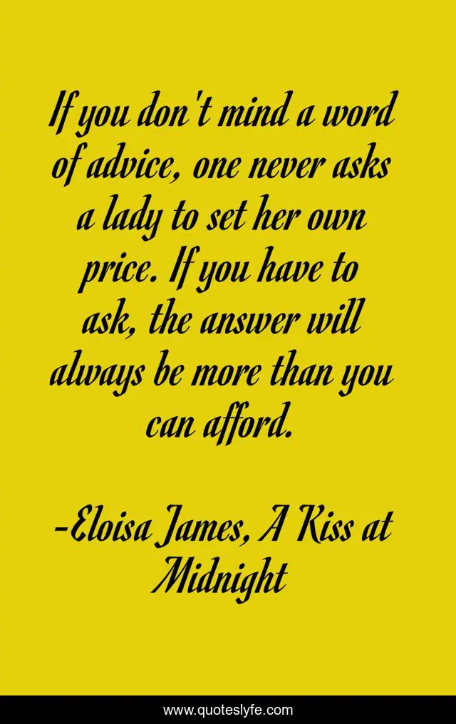 This page presents the quote "If you don't mind a word of advice, one never asks a lady to set her own price. If you have to ask, the answer will always be more than you can afford.". Author of this quote is Eloisa James, A Kiss at Midnight. This quote is about advice, lady, price,.