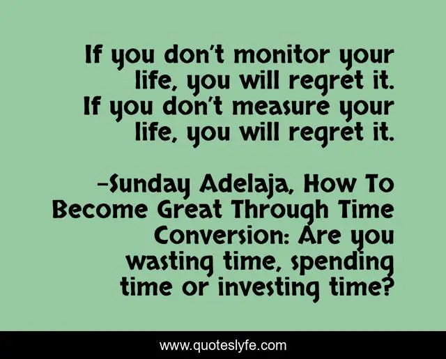 This page presents the quote "If you don’t monitor your life, you will regret it. If you don’t measure your life, you will regret it.". Author of this quote is Sunday Adelaja, How To Become Great Through Time Conversion: Are you wasting time, spending time or investing time?. This quote is about control, life, life-measurement, calling, conversion, productivity, monitor, greatness, waste,.