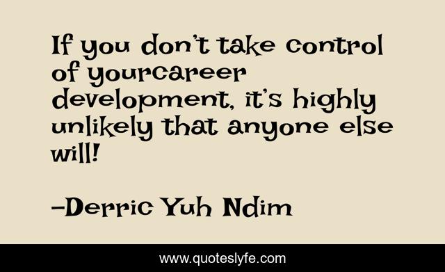This page presents the quote "If you don’t take control of yourcareer development, it’s highly unlikely that anyone else will!". Author of this quote is Derric Yuh Ndim. This quote is about entrepreneurship-training, inspiration, thinking, actions, entrepreneurship, unlocking-your-true-potential, values, inspirational-for-writers, personal-development,.