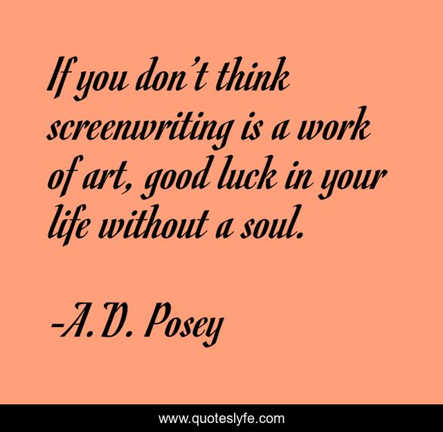 This page presents the quote "If you don’t think screenwriting is a work of art, good luck in your life without a soul.". Author of this quote is A.D. Posey. This quote is about story, art, storytelling, work-of-art, storytellers, soul, screenwriters, write, screenwriting,.