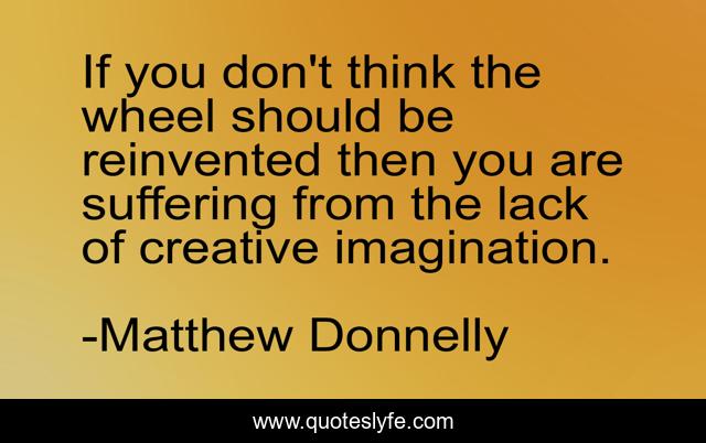 This page presents the quote "If you don't think the wheel should be reinvented then you are suffering from the lack of creative imagination.". Author of this quote is Matthew Donnelly. This quote is about personal-development, imagination, self-help, creative, personal-growth,.