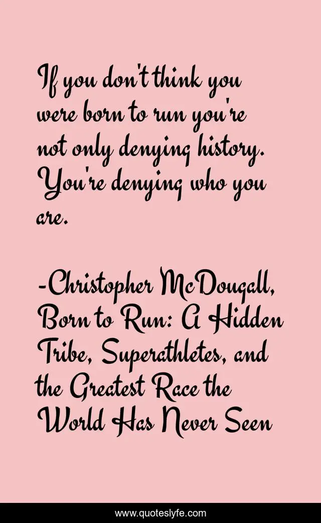 This page presents the quote "If you don't think you were born to run you're not only denying history. You're denying who you are.". Author of this quote is Christopher McDougall, Born to Run: A Hidden Tribe, Superathletes, and the Greatest Race the World Has Never Seen. This quote is about enthusiasm, running, inspirational,.