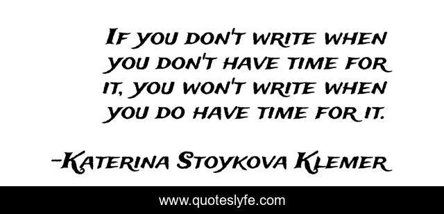 This page presents the quote "If you don't write when you don't have time for it, you won't write when you do have time for it.". Author of this quote is Katerina Stoykova Klemer. This quote is about motivation, human-nature, commitment, writing, time-management, time,.