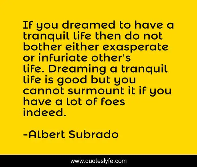 This page presents the quote "If you dreamed to have a tranquil life then do not bother either exasperate or infuriate other's life. Dreaming a tranquil life is good but you cannot surmount it if you have a lot of foes indeed.". Author of this quote is Albert Subrado. This quote is about advice, dream, life,.