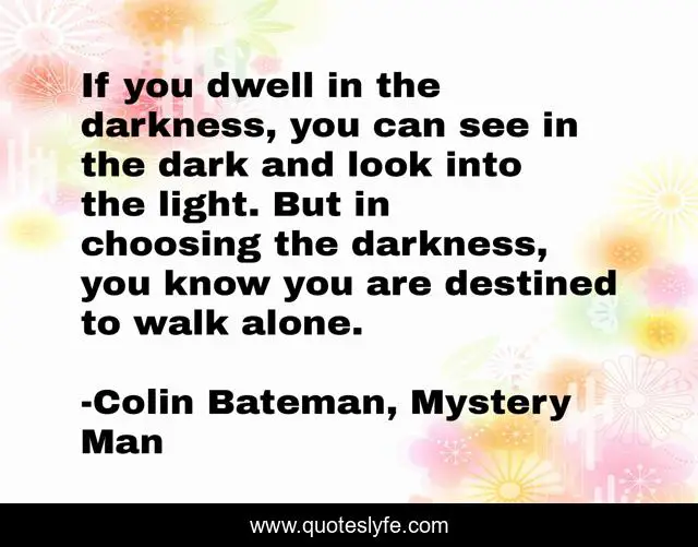 This page presents the quote "If you dwell in the darkness, you can see in the dark and look into the light. But in choosing the darkness, you know you are destined to walk alone.". Author of this quote is Colin Bateman, Mystery Man. This quote is about life, wisdom,.