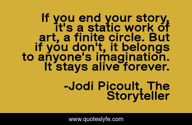 This page presents the quote "If you end your story, it's a static work of art, a finite circle. But if you don't, it belongs to anyone's imagination. It stays alive forever.". Author of this quote is Jodi Picoult, The Storyteller. This quote is about story, writing,.