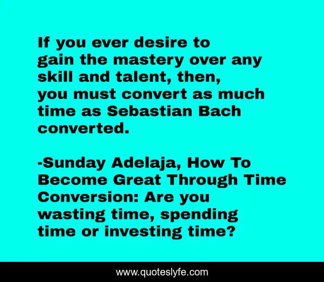 This page presents the quote "If you ever desire to gain the mastery over any skill and talent, then, you must convert as much time as Sebastian Bach converted.". Author of this quote is Sunday Adelaja, How To Become Great Through Time Conversion: Are you wasting time, spending time or investing time?. This quote is about life, skill, conversion, productivity, wealth, talents-and-gifts, greatness, waste, humanity,.