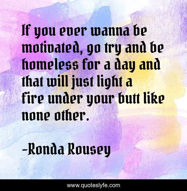 This page presents the quote "If you ever wanna be motivated, go try and be homeless for a day and that will just light a fire under your butt like none other.". Author of this quote is Ronda Rousey. This quote is about motivation, perspective, comfort-zone,.