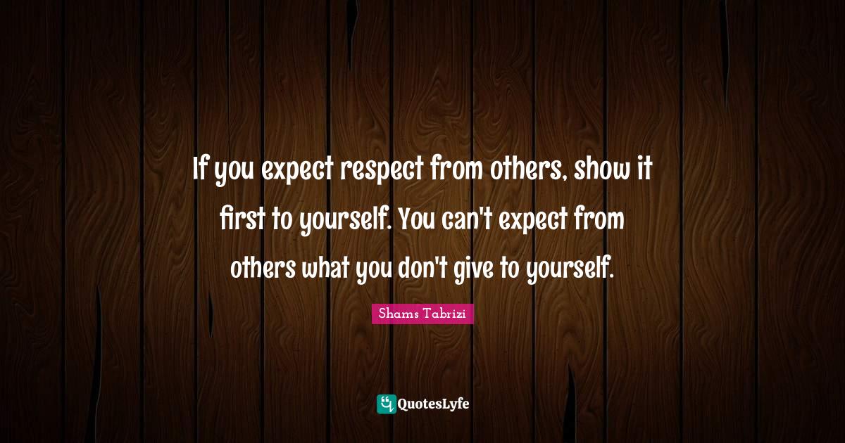 This page presents the quote "If you expect respect from others, show it first to yourself. You can't expect from others what you don't give to yourself.". Author of this quote is Shams Tabrizi. This quote is about shows, giving, firsts, respect,.