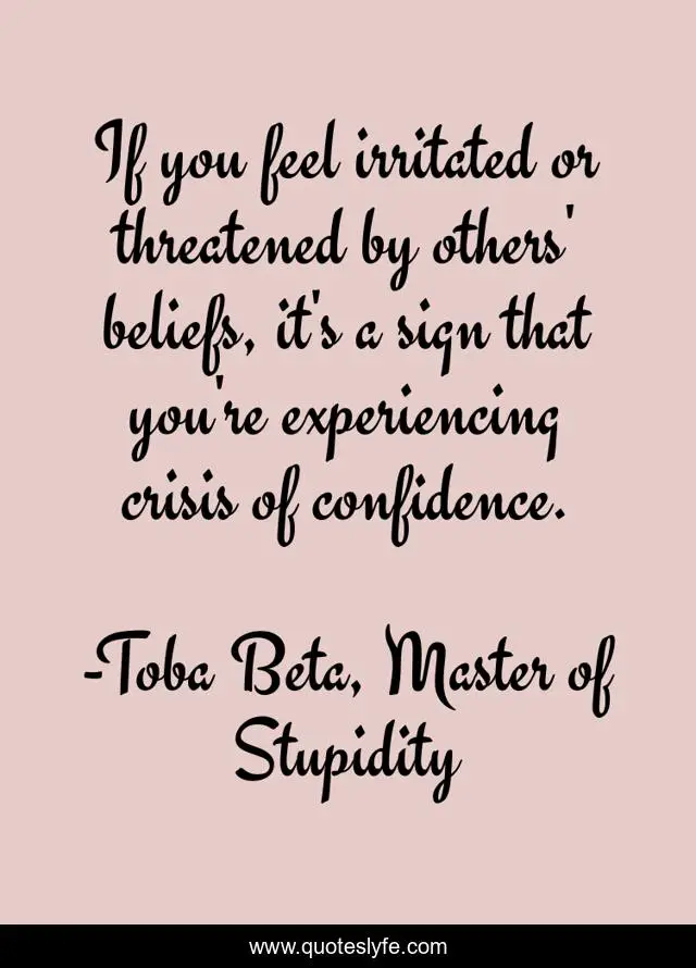 This page presents the quote "If you feel irritated or threatened by others' beliefs, it's a sign that you're experiencing crisis of confidence.". Author of this quote is Toba Beta, Master of Stupidity. This quote is about crisis-of-confidence, belief, experience, irritation,.