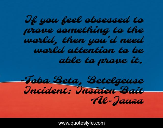 This page presents the quote "If you feel obsessed to prove something to the world, then you'd need world attention to be able to prove it.". Author of this quote is Toba Beta, Betelgeuse Incident: Insiden Bait Al-Jauza. This quote is about life, attention, success, prove, accomplishment, truth, world,.