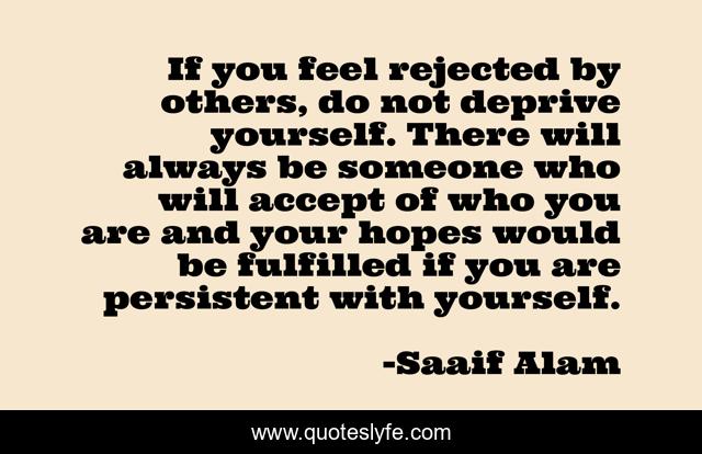 This page presents the quote "If you feel rejected by others, do not deprive yourself. There will always be someone who will accept of who you are and your hopes would be fulfilled if you are persistent with yourself.". Author of this quote is Saaif Alam. This quote is about education, socialization, morality,.