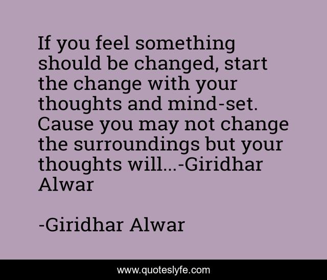 This page presents the quote "If you feel something should be changed, start the change with your thoughts and mind-set. Cause you may not change the surroundings but your thoughts will...-Giridhar Alwar". Author of this quote is Giridhar Alwar. This quote is about self-realization, self-help, inspirational, enthusiasm,.