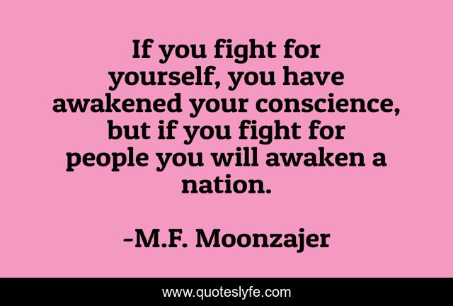 This page presents the quote "If you fight for yourself, you have awakened your conscience, but if you fight for people you will awaken a nation.". Author of this quote is M.F. Moonzajer. This quote is about conscience, fight, people, nation, awaken, nationalism,.
