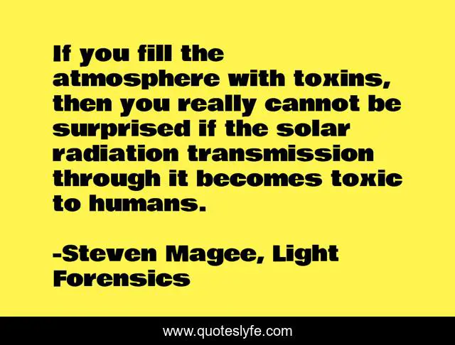 This page presents the quote "If you fill the atmosphere with toxins, then you really cannot be surprised if the solar radiation transmission through it becomes toxic to humans.". Author of this quote is Steven Magee, Light Forensics. This quote is about atmosphere, atmospheric, toxins, transmission, humans, human, radiation, sunlight, solar,.
