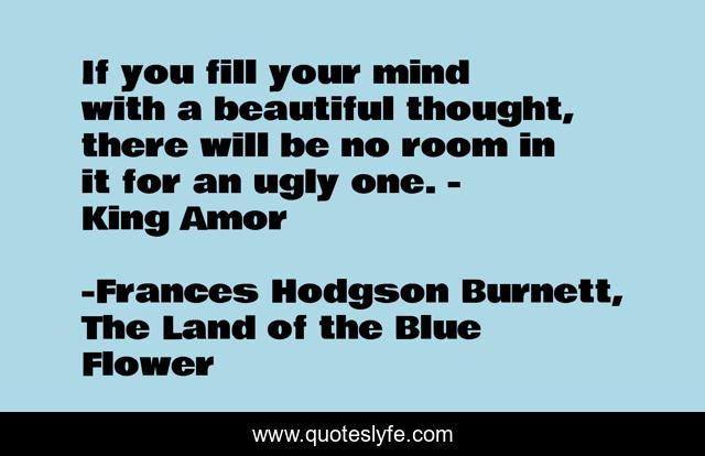 This page presents the quote "If you fill your mind with a beautiful thought, there will be no room in it for an ugly one. - King Amor". Author of this quote is Frances Hodgson Burnett, The Land of the Blue Flower. This quote is about ugly-thoughts, beautiful-thoughts, mind,.