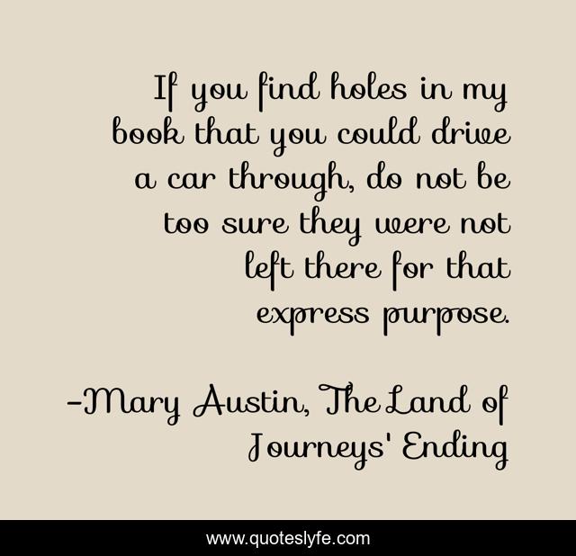 This page presents the quote "If you find holes in my book that you could drive a car through, do not be too sure they were not left there for that express purpose.". Author of this quote is Mary Austin, The Land of Journeys' Ending. .
