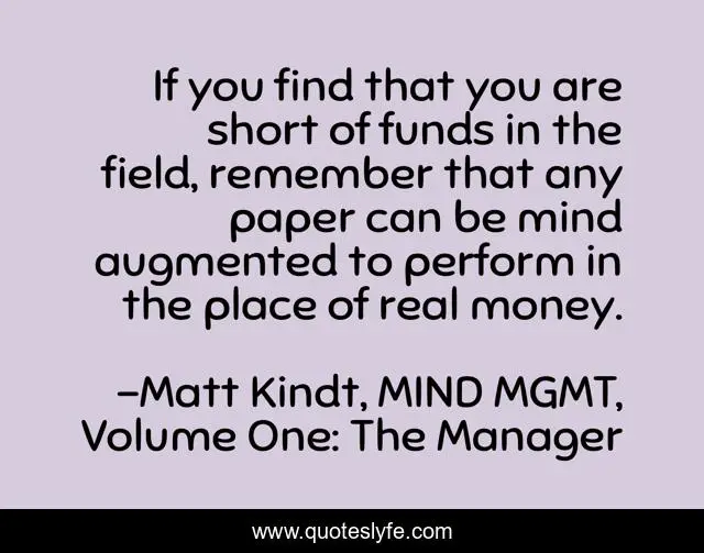 This page presents the quote "If you find that you are short of funds in the field, remember that any paper can be mind augmented to perform in the place of real money.". Author of this quote is Matt Kindt, MIND MGMT, Volume One: The Manager. This quote is about money, training, mind-control, mind-manipulation,.