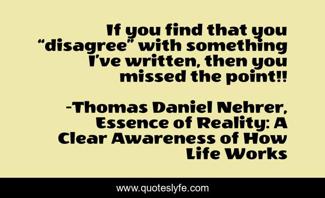 This page presents the quote "If you find that you “disagree” with something I’ve written, then you missed the point!!". Author of this quote is Thomas Daniel Nehrer, Essence of Reality: A Clear Awareness of How Life Works. This quote is about body-mind-spirit, philosophy, consciousness,.