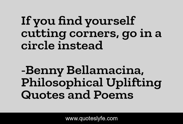 This page presents the quote "If you find yourself cutting corners, go in a circle instead". Author of this quote is Benny Bellamacina, Philosophical Uplifting Quotes and Poems. This quote is about life, humor, humour, quote, advice, philosophy, wisdom, comedy,.