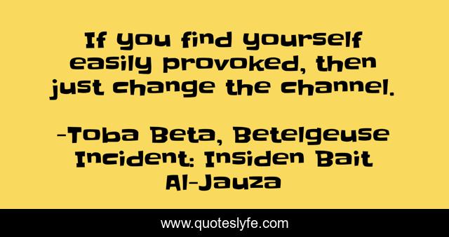 This page presents the quote "If you find yourself easily provoked, then just change the channel.". Author of this quote is Toba Beta, Betelgeuse Incident: Insiden Bait Al-Jauza. This quote is about stay-in-tune, channel, life-lessons, provoke, change, mindset,.
