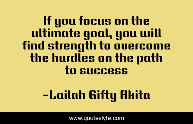 This page presents the quote "If you focus on the ultimate goal, you will find strength to overcome the hurdles on the path to success". Author of this quote is Lailah Gifty Akita. This quote is about path-of-life, strength, goal, success, focus, determination, overcomer, never-give-up,.