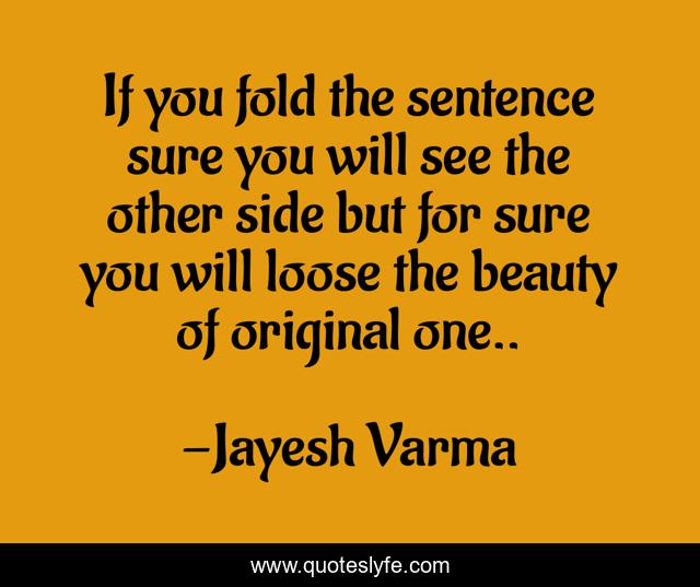 This page presents the quote "If you fold the sentence sure you will see the other side but for sure you will loose the beauty of original one..". Author of this quote is Jayesh Varma. This quote is about best-life, originality, person, best, sentences,.