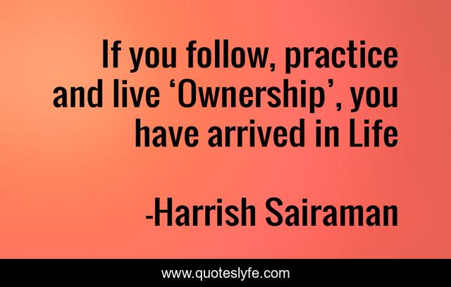 This page presents the quote "If you follow, practice and live ‘Ownership’, you have arrived in Life". Author of this quote is Harrish Sairaman. This quote is about life, practice, ownership, positive, motivational, confidence, arrived, optimistic, inspirational,.