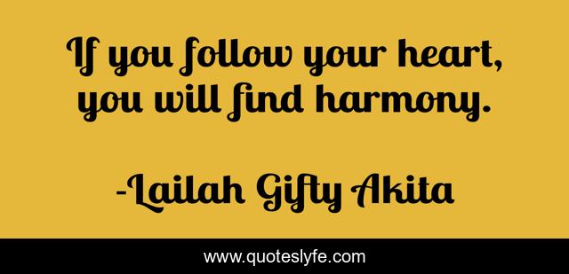 This page presents the quote "If you follow your heart, you will find harmony.". Author of this quote is Lailah Gifty Akita. This quote is about heart-desires, wishes, harmony, inspirational, inner-strength, enthusiasm,.