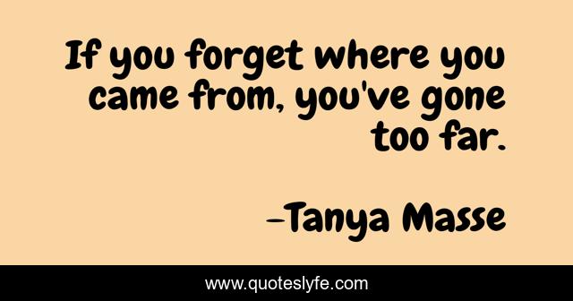This page presents the quote "If you forget where you came from, you've gone too far.". Author of this quote is Tanya Masse. This quote is about quotes-to-live-by, life, quotes-about-life,.